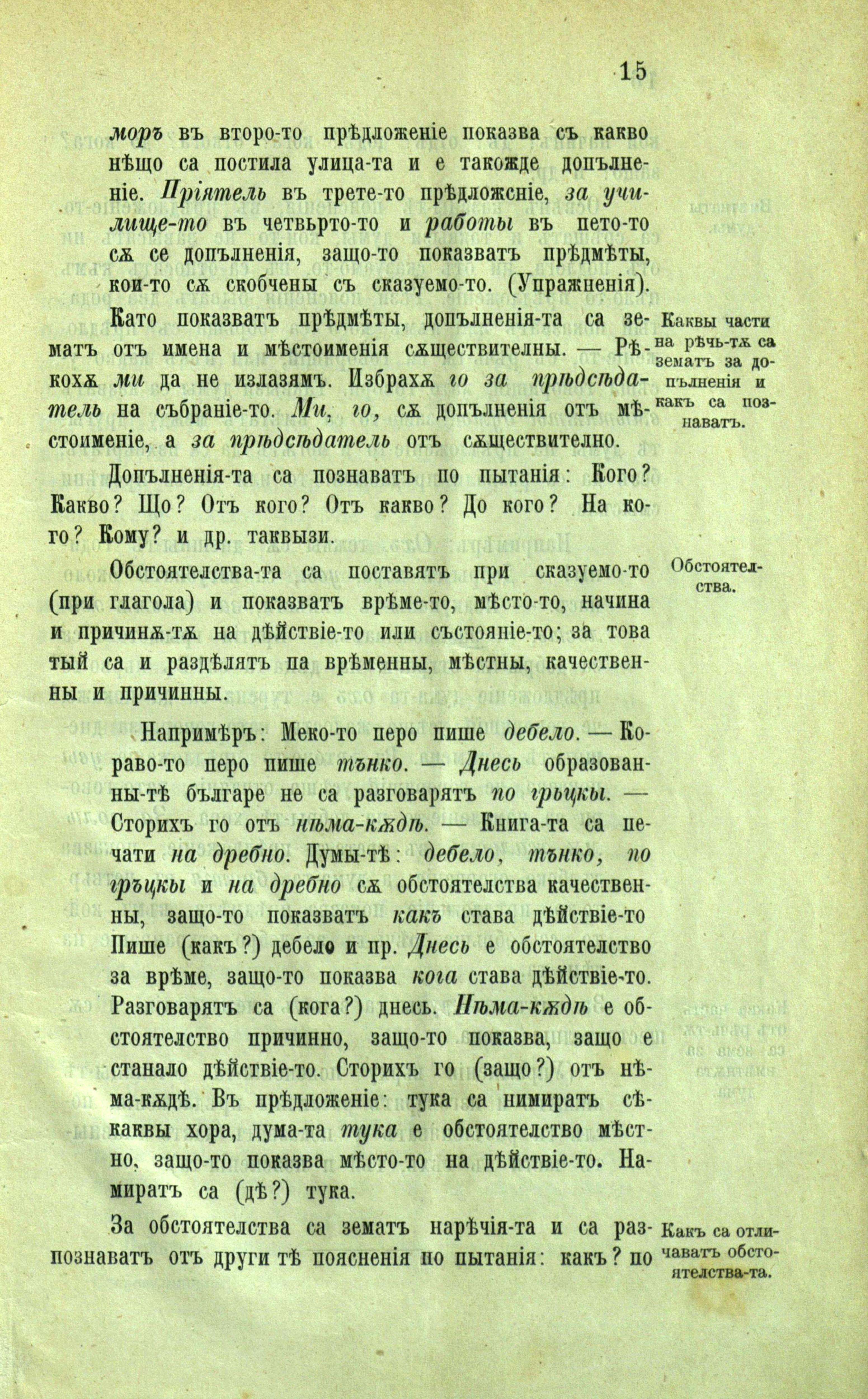 врѣменны,мѣстны, качествены и причинны Напримѣръ: Мекото перо пише дебело. Кораво-то перо пише тънко. Днесь образованы-тѣ българе не са разговарятъ по грьцкы. Сторихъ го отъ н ма-кѫдѣ Книга-та са напечати на дребно Думы-тѣ:дебело,тънко,по грьцкы,на дребносѫ обстоятелства качествены, защо-то показватъ какъ става дѣйствiе-то. Днесь е обстоятелство за врѣме,защо-то показва кога става дѣйствiе-то. Н ма-кѫдѣ е обстоятелство причинно защо-то показва, защо е станало дѣйствiе-то. Въ прѣдложенie: