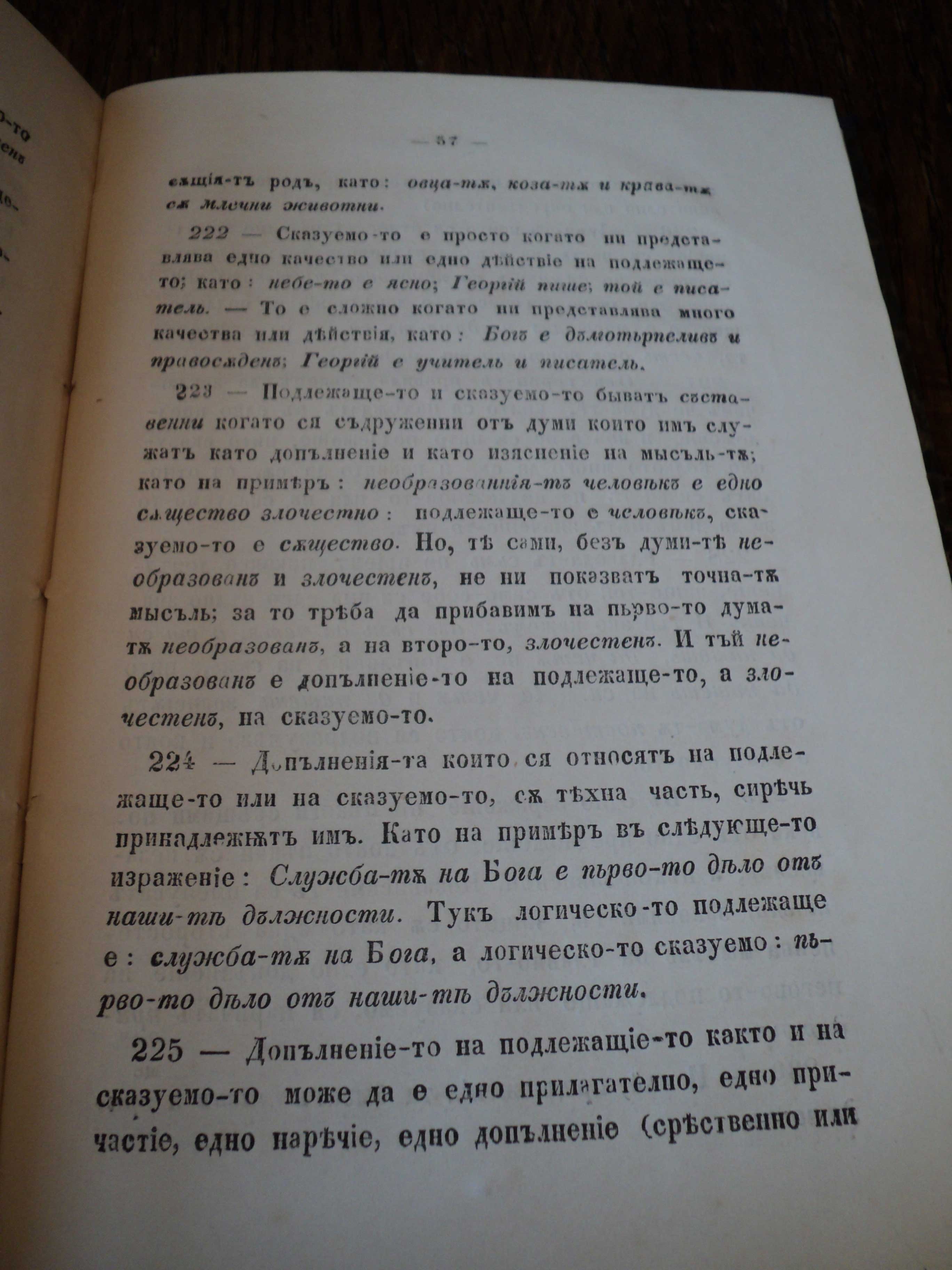 Подлежаще-то ни показва предмета-тъ или разсѫдокъ-тъ; - Сказуемото, негово-то сѫстоянiе или качество, което му отдавами;-Сврьска-тѫ е която съединява подлежаще-то със сказуемо-то. Като на примѣръ въ по-горньо-то предложение: Богъ е правосѫденъ; Богъ е предмета-тъ за когото разсѫждавами, ето подлежаще-то; правосѫденъ е качество-то което нахождами въ Бога, ето сказуемо-то; e e глагола-тъ който сврьзва двѣта горни части, ето сврьска-тѫ.